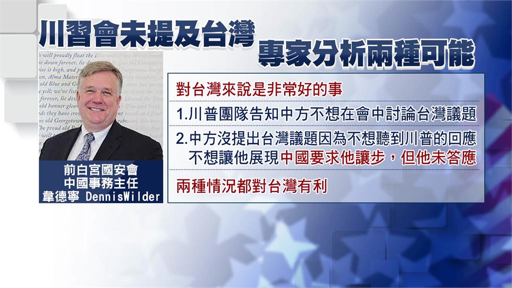 全球矚目的「川習會」於昨(30)日登場,歷時約1小時40分鐘,美國總統川普(Donald Trump)事後透露,會談全程沒有提及「台灣」。白宮國安會前中國事務主任「韋德寧」分析,這可能是美方提前告知北京不希望討論此事,或是中方不願聽到川普的回應,但無論是哪一種情況,對台灣而言都相對有利。