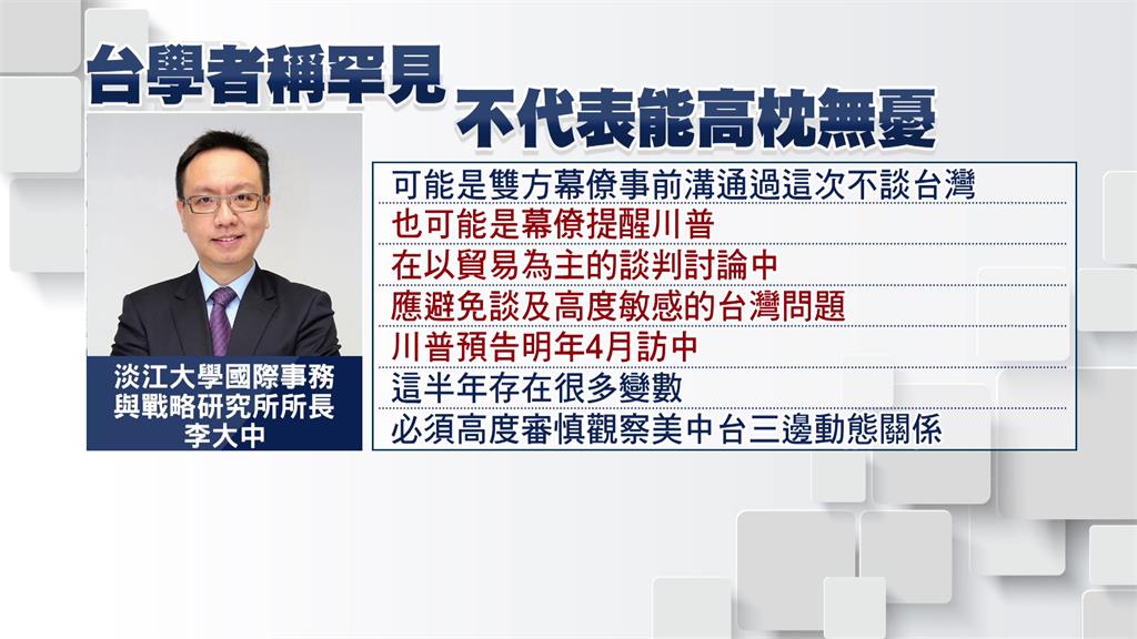 不過,友台的美國民主黨參議員絲拉金認為,川普至少應重申對台政策,而非完全不提;淡江大學國際事務與戰略研究所教授兼所長李大中則表示,這次會談以貿易為主,川普可能在幕僚建議下,避免觸及高度敏感的台灣議題,但仍須留意後續發展。川普已預告於明年4月訪中,這半年中存在不少變數,台灣應持續關注美中台三邊關係變化。