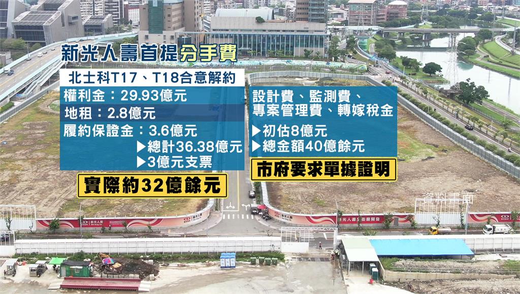新壽與北市府的「分手費」初估為40多億。圖/台視新聞新光人壽30號與北市展開協商,提出成本結構,包括已繳權利金29.93億、地租2.8億、履約保證金3.6億,扣掉3億元是支票,已付給市府約32億元;再加上設計、監測、專案管理等費用初估8億,總計大約40億餘元,但市府要求新壽出示單據證明,雙方下週繼續協商。