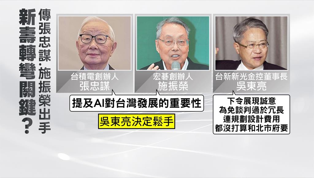 傳張忠謀與施振榮找上勸說,才讓新壽態度轉彎。圖/台視新聞新壽日前大動作召開記者會同意解約,傳出是因為台積電創辦人張忠謀與宏碁創辦人施振榮,兩人勸說台新新光金控董事長吳東亮,提及AI對台灣發展重要性,讓他決定鬆手;也傳出吳東亮下令展現誠意,避免談判太冗長,連規劃設計費都沒打算要。