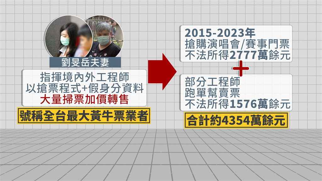 他們靠指揮境內外工程師,以搶票程式跟假身分資料,大量掃票加價轉售,光是2015到2023年,賣演唱會及體育賽事門票就獲利2千多萬元,加上部分工程師跑單幫賣票,合計超過4千萬。