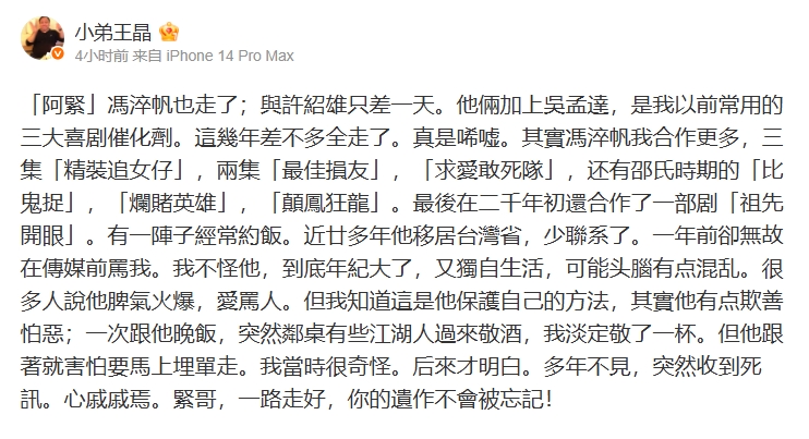 王晶提到以前兩人一起吃晚飯時,隔壁桌有些江湖人過來敬酒,他淡定回應,但馮淬帆卻想馬上買單走人,這讓王晶當下感到奇怪,後來才明白「多年不見,突然收到死訊。心有戚戚焉。緊哥,一路走好,你的遺作不會被忘記!」