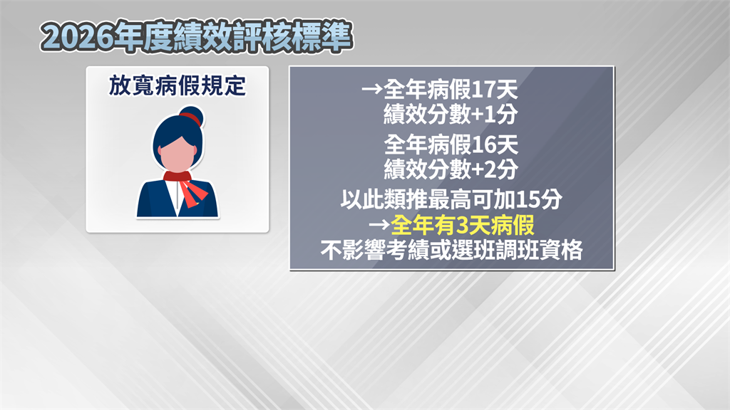 2026年的績效評核標準,空服員如果全年病假請17天,績效分數只能加1分,請16天績效分數則加2分,請得越少績效分數越高,最高加15分,也就是大家都拚全勤加15分的情況下,一年就算請了3天病假績效也還能算滿分,不會影響考績或選班調班資格。