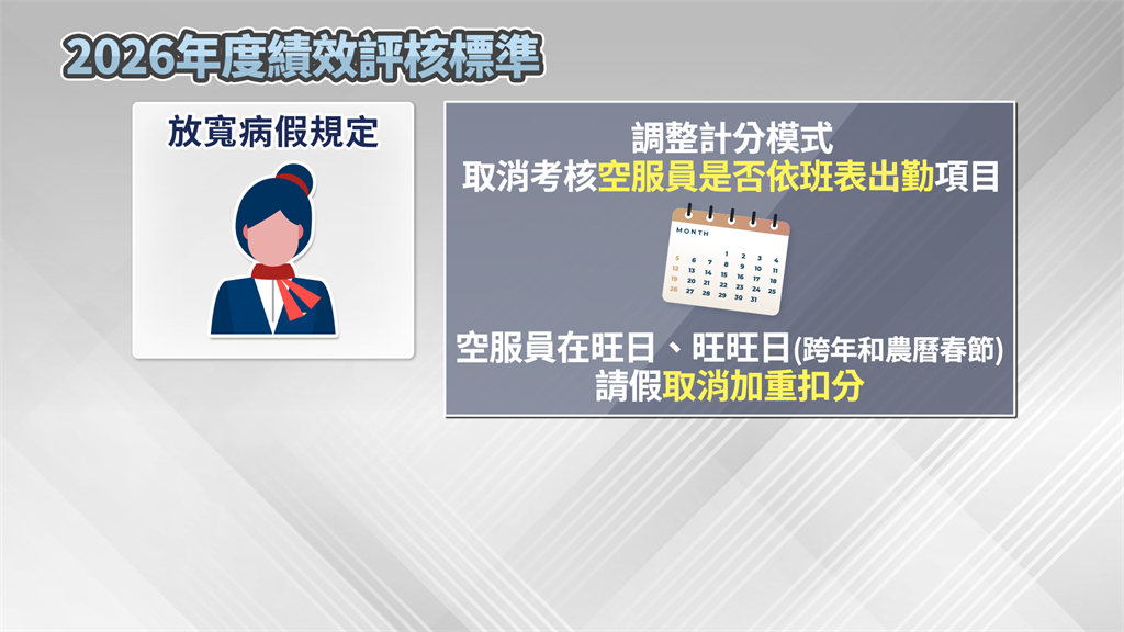 空服員病假放寬規定。圖/台視新聞另外,長榮航空也調整計分模式,取消考核「空服員是否依班表出勤」的項目,還有以往空服員在旺日及跨年和春節等「旺旺日」請假都會加重扣分,如今一併取消。