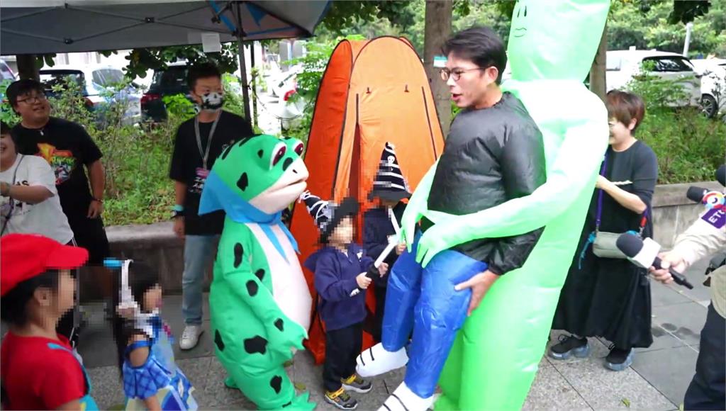 來到新北,民眾黨黨主席黃國昌卸下在立法院時犀利的模樣,展現親和力,一身裝扮像極了被外星人抓走的人,只是小朋友們似乎都沒打算要救他。