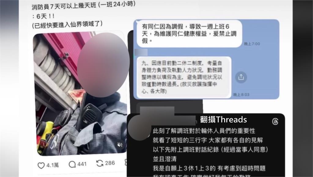 有消防PO文,導致台中消防局長宣布禁止調假。圖/翻攝自threads消防人員冒險挺進火場救災,還是事故現場衝第一搶救傷患,總是都能見到消防員的身影,但現在卻因為一篇PO文,害消防員休假大亂。一名消防員PO網詢問網友,「消防員7天可以上幾天班,一班24小時,答案是6天,已經快要進入仙界領域」。