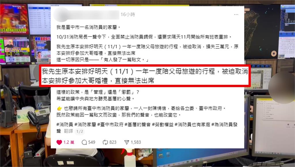 這則貼文讓消防局長就公告,因為同仁調假導致一週上班6天,為了維護同仁健康權益,禁止調假,31號晚間七點宣布,隔天11月1號馬上就開始實施,引發消防員和家屬反彈。