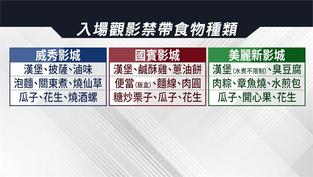 各大影城幾乎都有明定禁帶入場的食物種類,威秀影城列出披薩、滷味,以及高溫熱燙的泡麵、關東煮等;國賓影城也禁止鹹酥雞、蔥油餅、麵線、肉圓、糖炒栗子等;至於美麗新影城,則規定臭豆腐、肉粽、章魚燒等不能攜帶入內,以上三家影城也都一致禁止瓜子、開心果等會發出噪音的食物,而漢堡也都禁止攜帶,避免影響觀影體驗。
