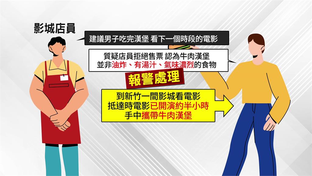 新竹有民眾要看電影,抵達影城時電影已經開演近半小時,且他手中的牛肉漢堡是影城規定禁止攜帶入場的食物,店員建議他吃完,再看下一個時段的電影,但男子質疑店員拒絕售票給他,認為牛肉漢堡並非「油炸、有湯汁、或氣味濃烈」的食品,雙方爭論不休,男子甚至氣到報警處理。