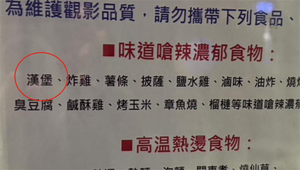 影城表示,門口的告示牌明確標示,請勿攜帶味道嗆辣、濃郁的食物入場觀影,其中一項就是漢堡!