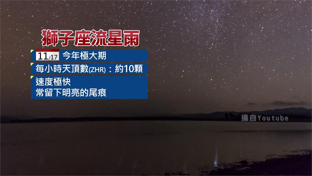 本月17日時還將迎來獅子座流星雨。圖/台視新聞、翻攝自YT除了最大滿月外,今年最亮的萊蒙彗星,它在10月21日通過近地點,11月8日通過近日點,10月30日最亮,亮度可高達4等左右!另外,獅子座流星雨,今年極大期在11月17日,雖然不會出現流星暴,但每小時天頂數仍有約10顆左右,流星特徵為速度極快,常留下明亮的尾痕。民眾可找個視野開闊、光害少的地方,仰望夜空,就有機會欣賞到浪漫又壯麗的天文盛宴。
