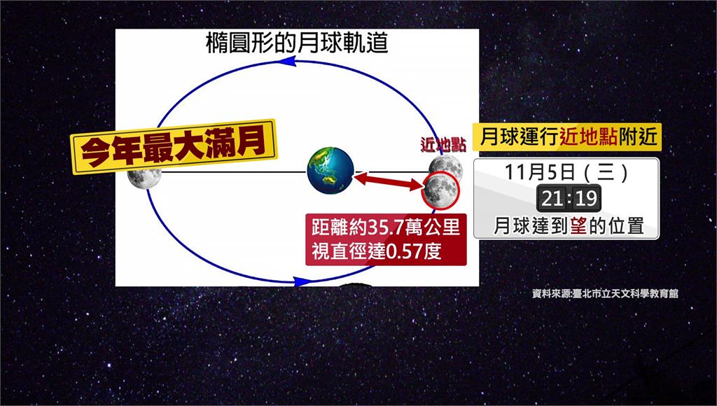 今年最大滿月將在11月5日可以看到。圖/台視新聞又大又圓的月亮高掛天空,這是去年10月出現的「超級月亮」,民眾直呼好美、好浪漫。而今年超級滿月即將登場!還會比去年來的更大、更亮!台北市立天文館指出,今年11月5日,月球會運行到「近地點」附近,當晚21時19分,月球會達到「望」的位置,距離地球約35.7萬公里,視直徑達0.57度,是今年最大滿月,也是近6年來最大的超級滿月。
