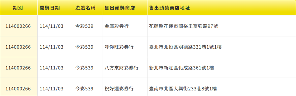 而今彩539頭獎開出4注,分別從北市「呼你旺彩券行」、新北「八方來財彩券行」、花蓮「金庫彩券行」、台南「祝好運彩券行」開出,每注獎金6百萬。