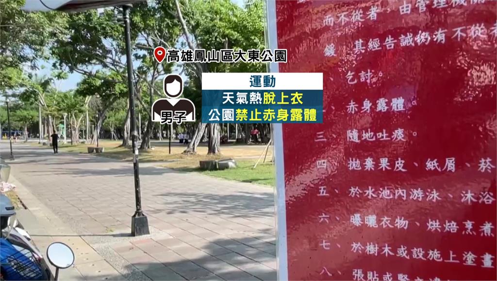 男子屢勸不聽,最後被開罰2000元。圖/台視新聞其實該公園內告示牌就清楚寫著禁止赤身露體,而男子卻是勸導不聽,已影響其他民眾休憩品質,這才被開罰。也有同在該公園運動的民眾表示「說實話不雅觀,那個身材又不怎麼好」、「來運動一定打赤膊,造成我們這邊的困擾,屢勸不聽,講N次了」,畢竟公園是大家的,不少女生跟小孩也會經過,難免觀感不佳。就算天氣熱,也應穿著得體,以免影響他人權益。