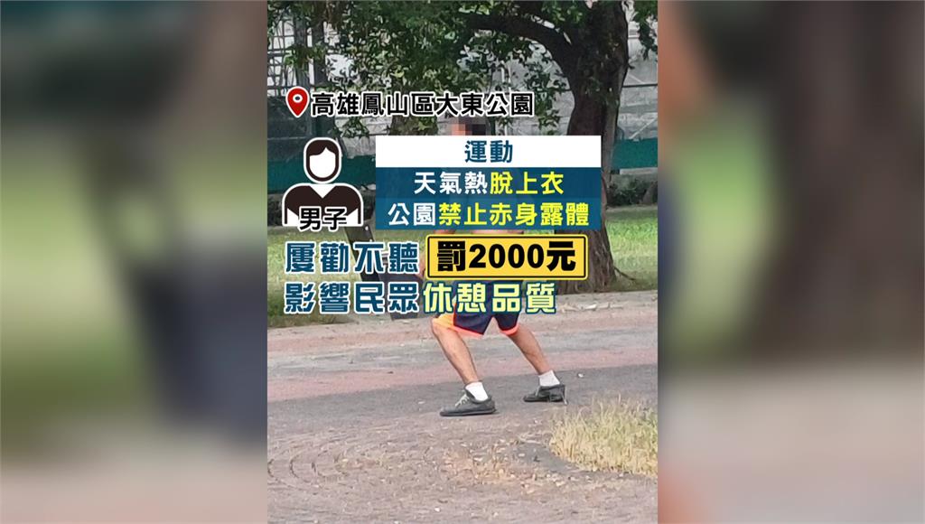 高雄一名男子到鳳山區一處公園運動,似乎覺得天氣熱,時常脫掉上衣打球,但當地有長輩、有小孩,也會有女性經過,有人沒穿上衣,實在是「不好看」,相關單位接到陳情,屢次勸導,偏偏男子不聽勸,照打赤膊運動,由於公園有規定「禁止赤身露體」,男子最後被開罰2千元。