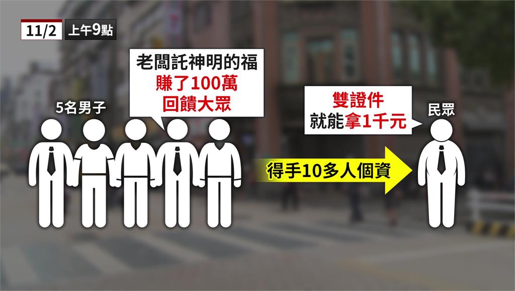 在台北萬華竟有人打著「做公益、發現金」的名義當街擺攤,聲稱老闆託神明的福賺了100萬要回饋,只要繳交雙證件影本,就能領一千塊。警方趕到現場後發現,這根本不是什麼回饋活動,而是疑似詐騙集團蒐集個資的手法,提醒民眾別為了小利輕易洩漏身分資料。