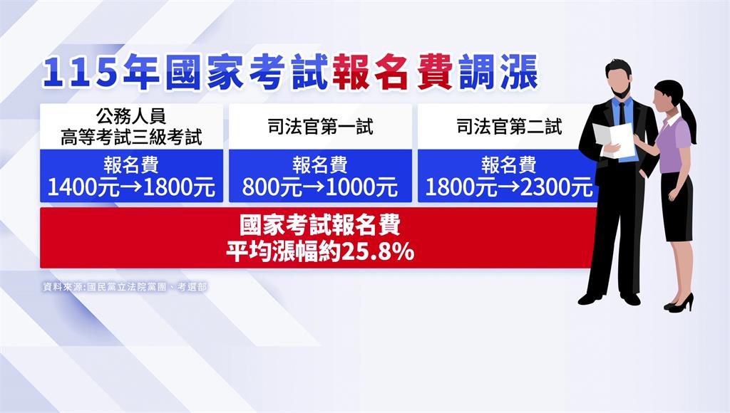 根據國民黨立法院黨團及考選部資料,公務人員高等考試三級考試報名費將從1400元調漲至1800元;司法官第一試從800元調至1000元;司法官第二試從1800元調至2300元,國家考試報名費的平均漲幅約為25.8%。