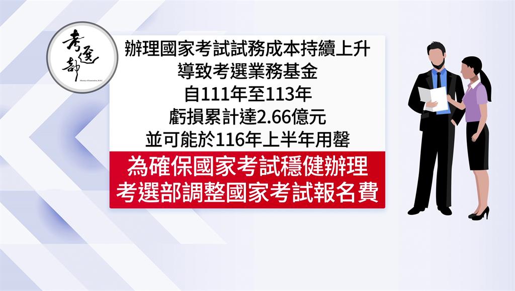 考選部表示,國家考試的財務主要收入來源為應考人的報名費,但目前多數國家考試的收費基準,已超過10年未曾調整,試務成本卻持續上升,導致考選業務基金累積虧損,預估可能於116年上半年用罄,因此才決定調整國考報名費。