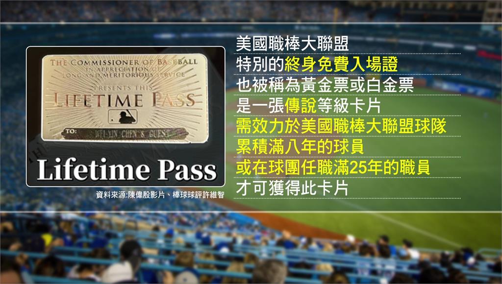 這張「終身通行證」可說是一張「傳說級」卡片。圖/台視新聞這張卡片可讓持卡人終身免費進入任何一座MLB球場觀看例行賽,還能攜帶一名賓客同行。而在陳偉殷之前,全台只有王建民獲得,如今他也正式被列入傳奇名單,這張傳說卡片不只是「通行證」,更是一份回顧職業生涯的榮譽紀念。