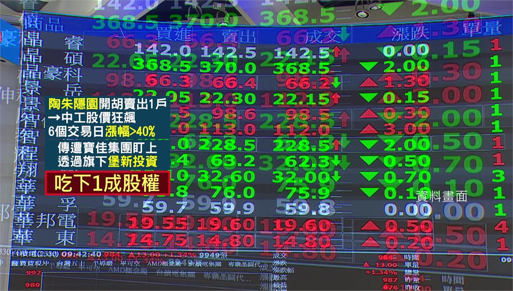 其中中工因為日前陶朱隱園開胡賣出1戶,短短6個交易日內漲幅就超過40%,但背後似乎並不單純,傳出中工遭到寶佳集團盯上,透過旗下的堡新投資出手吃下10%股權,週二中工股價開盤後,早盤一度漲9%,逼近漲停。