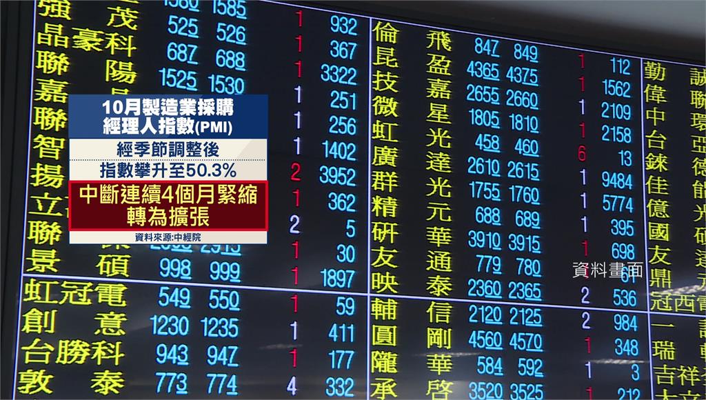 而中經院也發布十月製造業採購經理人指數PMI,經過季節調整後,指數攀升到50.3%,中斷連續四個月的緊縮,轉為擴張。