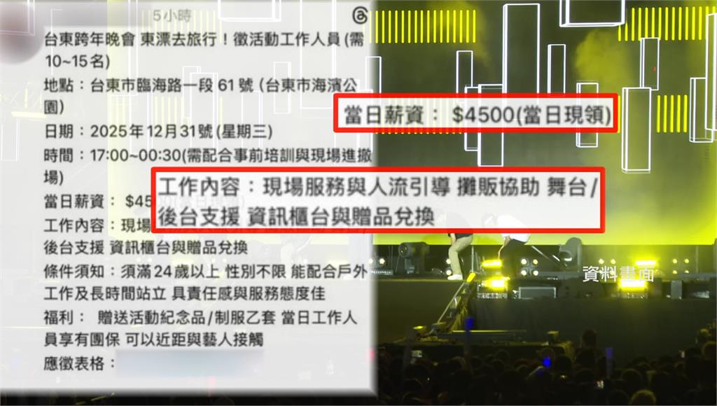 詐團假冒台東跨年晚會工作人員開出高薪,想騙民眾各資。圖/台視新聞一天開出4500元高薪,徵台東跨年晚會工作人員,看起來專業又誘人,其實是詐騙陷阱,台東縣長饒慶鈴也親自拍影片,提醒縣民別受騙上當,「感謝關心台東縣政府,今年的跨年晚會活動,現在網路上有很多詐騙行為,台東縣政府在這裡鄭重澄清,當天的活動是免費入場,也並沒有因為跨年晚會活動,而對外徵求任何臨時工作人員,請千萬不要將您的個資任意交出去,以免被騙」。