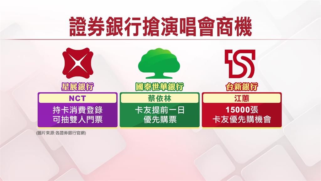 銀行業者也加入搶攻演唱會商機,星展銀行大方推出刷卡完成指定任務即可獲得NCT雙人門票的活動;國泰世華與台新銀行則分別贊助天后蔡依林與二姐江蕙演唱會,提供卡友專屬搶票禮遇。