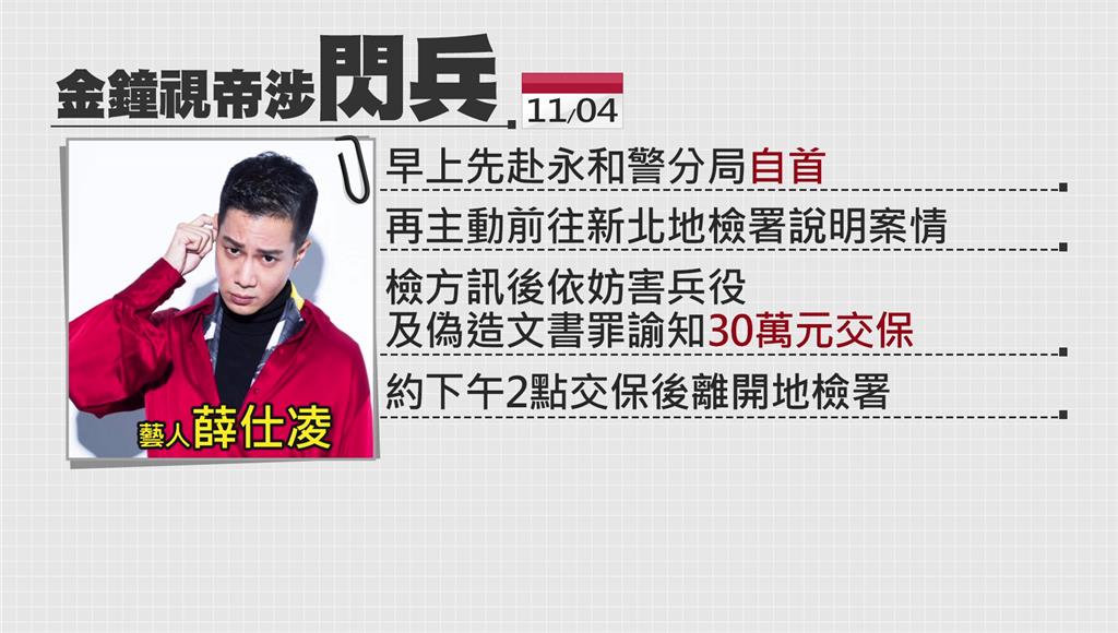 薛仕凌今早先到永和警分局自首,隨後主動前往新北地檢署說明案情。檢方訊後,依妨害兵役及偽造文書罪諭知「30萬元交保」,於下午約2點交保後離開地檢署。