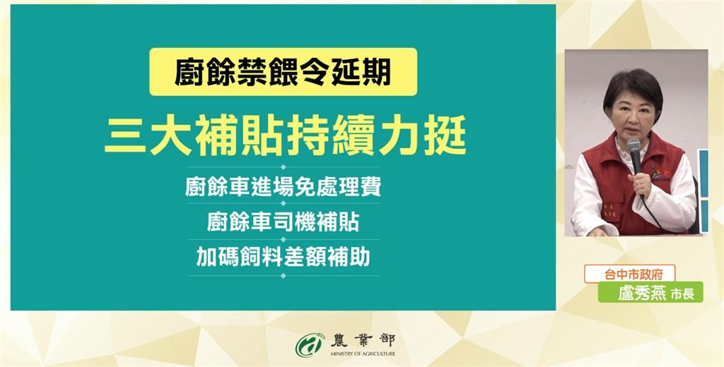 盧秀燕表示,廚餘養豬業者若因改用飼料導致成本增加,市府將持續提供補貼,廚餘清運業者的進場費與司機辛勞津貼也會在禁制期間持續發放,豬肉攤每日加碼津貼同樣維持。