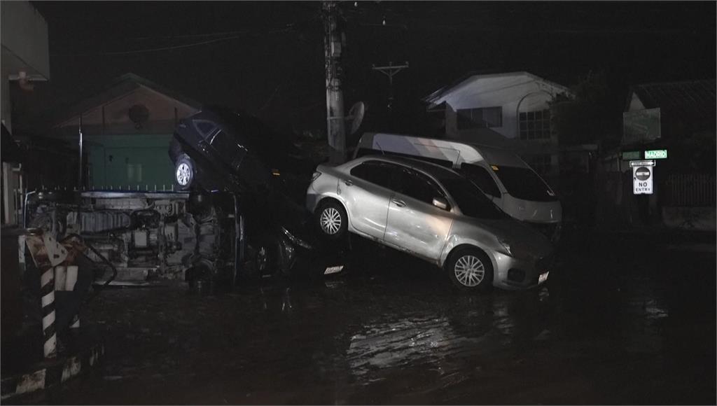 海鷗颱風挾帶強大風雨重創菲律賓。圖/路透社、美聯社民眾從高處直擊汽車被洪流沖走,車尾燈一度亮起,疑似有人受困車內隨水漂流。在菲律賓宿霧省曼達維市,汽車、卡車甚至是大型貨櫃紛紛都被洪流捲走,社區一片汪洋,民眾緊急採取垂直避難,躲到屋頂上,祈禱水位不要愈漲愈高。