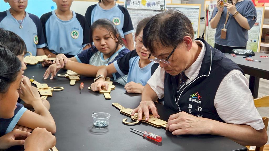 台中市豐原區翁子國小趣玩STEAM館,教育局蔣偉民局長與學童一同實作組合衣架。圖/台中市政府新聞局提供打造下一代科學力!讓學習與未來接軌