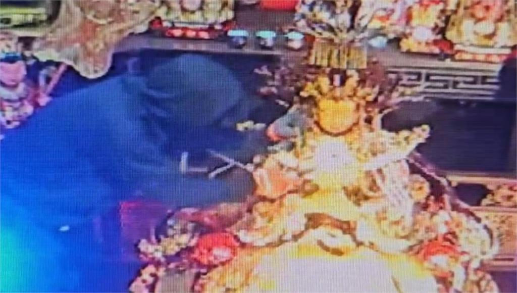 小偷從窗戶鑽入廟內,踩過供桌對珊瑚媽祖神像下手。圖/台視新聞整個犯案過程長達45分鐘,不料偷完後,意外觸動保全系統,警衛立刻趕到現場巡查,但當時外圍沒異狀,直到凌晨4點多廟方開門準備上香,才驚覺媽祖身上的珠寶首飾被偷了。