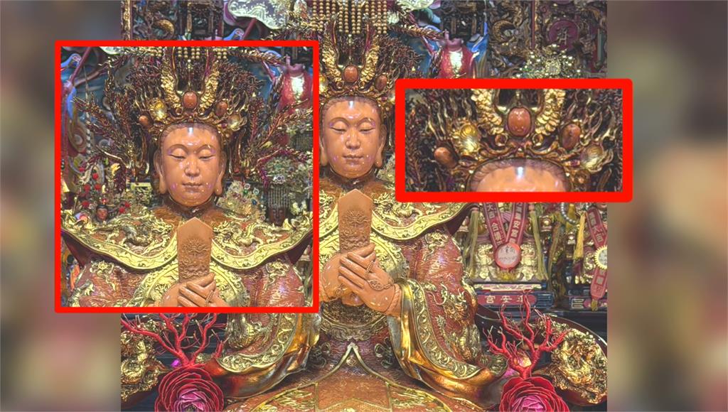 媽祖神像上的金飾、珊瑚珠被小偷竊走。圖/台視新聞廟方仔細清點後發現,帽緣原本有五顆大圓珊瑚珠,如今只剩三顆,上半身的四件黃金飾品也全數不翼而飛,估計損失超過兩千萬。如今廟方遭竊,不只心痛,也讓信眾相當氣憤,希望警方盡快破案,替媽祖討回公道。