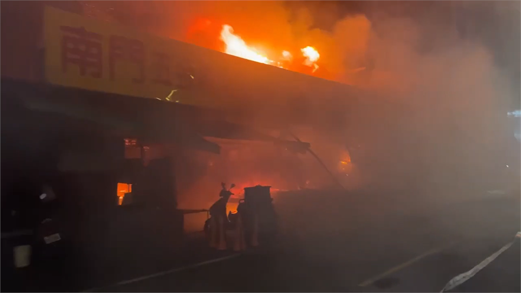 南門市場火勢一度相當猛烈。圖/民眾提供大火來的又猛又急,桃園消防5日晚間9點36分獲報,抵達現場時,南門市場前半段幾乎都遭火舌吞噬,滾滾黑煙不斷竄出,還不時傳出「劈哩啪啦」爆炸聲響,消防員人趕緊在南門市場門口拉起封鎖線、佈水線灌救,過程中,還驚險引導救出一名83歲老翁,幸好人平安沒受傷。