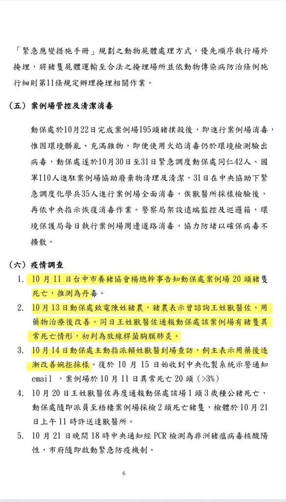 另外台中市府寫王姓獸醫佐在10月13日「通報疫情」,他嚴正否認,表示10月13日時豬農打來說狀況改善、準備出豬,請他不用到現場,因此當天根本沒有進行通報動作。一直到10月19日豬農再度告知豬隻死亡,才在隔日首度前往案場,說服豬農通報,並協助通報。王姓獸醫佐也質疑,14日市府派員前往現場時,為何未即時採檢?