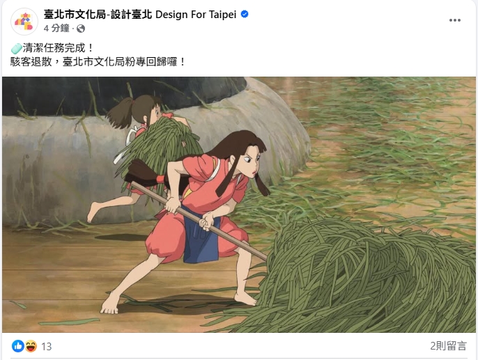 晚間八點多時,北市文化局成功拿回帳號。圖/翻攝自台北市文化局臉書直到晚間8點左右,北市文化局也成功拿回臉書帳號,發出一張《神隱少女》小千打掃澡堂的圖片,表示「清潔任務完成!駭客退散,台北市文化局粉專回歸囉!」