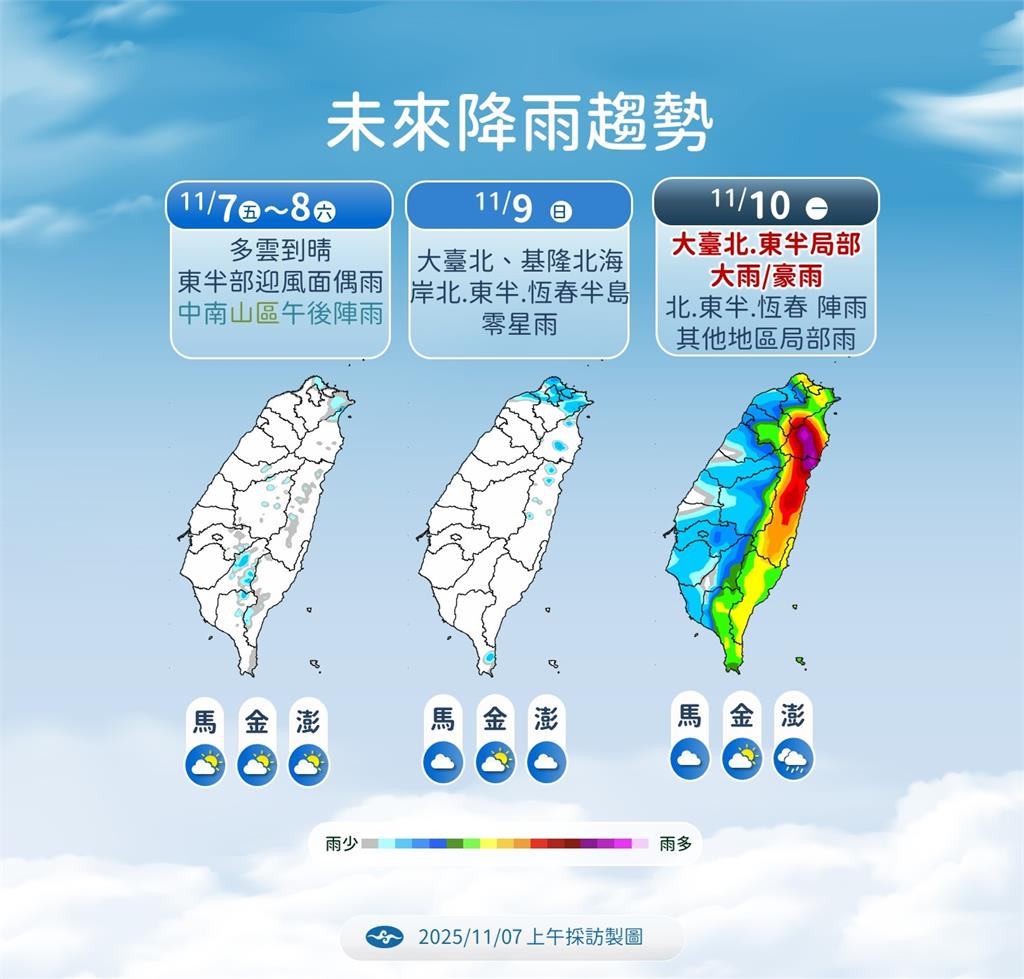 氣象署指出,下週一至週三為降雨最顯著的時段。圖/中央氣象署提供氣象署強調,南部與其他地區雨勢的強弱,將與鳳凰實際路徑遠近等高度相關。若颱風於週四起逐漸遠離或強度明顯減弱,屆時降雨範圍將不若前幾天廣泛,僅在局部地區仍有大雨發生的可能。