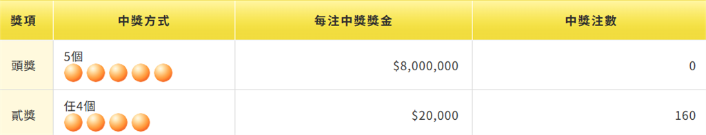 台彩。圖/台視新聞(資料畫面) 台灣彩券今(7)天公布第114000103期大樂透獎號,派彩結果出爐,頭獎槓龜無人中獎,下期頭獎上看6.2億;今彩539頭獎槓龜,二獎開出160注,每注可得獎金2萬元。今彩539貳獎開出160注。圖/翻攝自台彩官網派彩結果及中獎號碼以台彩官網公布為主。責任編輯/蔡尚晉