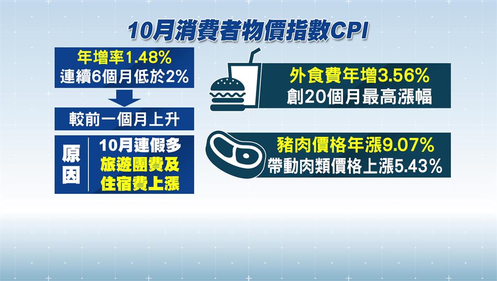 雖然近期物價漲勢趨緩,不過民眾在外吃東西和租屋仍有負擔,主計總處公布10月消費者物價指數,年增率為1.48%。雖然連續6個月低於2%,但較前一個月上升,主因是10月連假多,旅遊團費及住宿費上漲;其中外食費年增3.56%,創20個月最高漲幅;豬肉價格年漲9.07%,帶動肉類價格上漲5.43%。