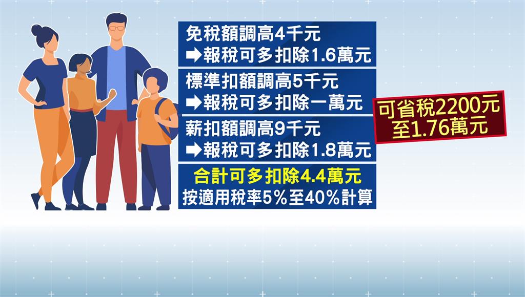 課稅級距方面也將同步上修,以雙薪四口家庭為例,免稅額增加4千元、標準扣額多一萬元、薪資扣除額多1.8萬元,合計起來可多扣除4.4萬元,按適用稅率5%至40%計算,可省下2200元至1.76萬元的稅。