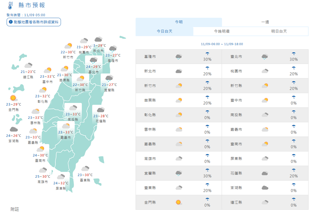 氣溫方面,中南部高溫可達30至33度,溫暖微熱,北部及東半部則是27至30度,但各地早晚仍涼,低溫為21至24度,日夜溫差較大。離島天氣,澎湖陰天24至26度;金門晴時多雲23至29度;馬祖陰時多雲20至23度。