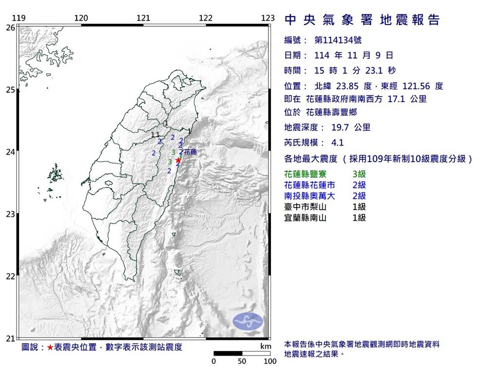 今(9)日下午15時01分花蓮縣壽豐鄉(花蓮縣政府南南西方17.1公里)發生規模4.1地震,地震深度19.7公里,最大震度位於花蓮鹽寮的3級,全台共4縣市有感。各縣市震度分別為,花蓮縣3級、南投縣2級、台中縣1級、宜蘭縣1級。地震報告。圖/中央氣象署提供責任編輯/周瑾逸
