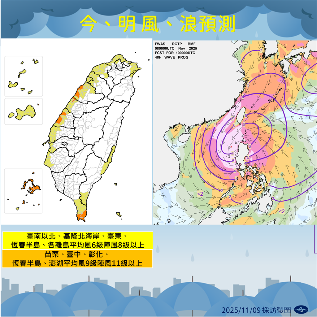 今明風浪預測。圖/氣象署提供風浪方面也會逐漸增強,在台南以北、基隆北海岸、台東、各離島都會有平均風6級、8級以上陣風以上強風;苗栗、颱風、彰化、恆春半島、澎湖則會有平均風9級、陣風11級以上強風。