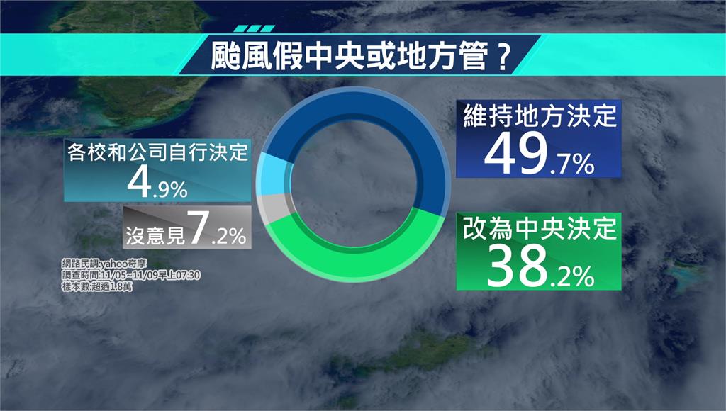 初步結果,有近5成民眾認為應該維持地方決定。圖/台視新聞停班課、究竟該由中央還是地方管?Yahoo網站做網路民調,截至週日早上,總計超過1.8萬人投票,初步結果有約五成民眾,認為應該維持地方決定;傾向回歸中央宣布的人,則有約3成8;另外,有4.9%的民眾,表示由各校和公司自行決定比較恰當,實際詢問民眾,也是大多傾向,由地方政府來決策。