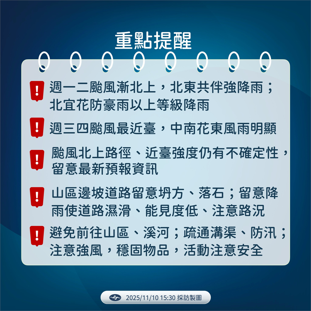 隨著颱風北上,東北季風與颱風外圍環流將在今明兩天為北部及東半部帶來局部明顯降雨,大台北、宜蘭及花蓮需注意局部豪雨,北海岸及宜蘭累積雨量已達90至150毫米。11日下半天起,中南部降雨將逐漸明顯,週三、週四降雨最劇,沿海及山區需留意坍方、落石及道路濕滑。