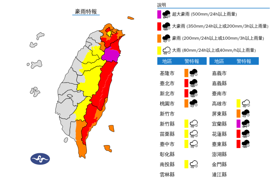 豪雨特報。圖/翻攝自氣象署網頁氣象署預報科長林秉煜表示,今天晚上到明天白天東半部降雨仍明顯,明天晚上一直到週三清晨,東半部地區降雨情況會逐漸緩和,到週三白天颱風預計登陸中部或南部地區,連同南部也帶來降雨,不過大概持續約半天,就會隨颱風遠離、減弱而趨緩。