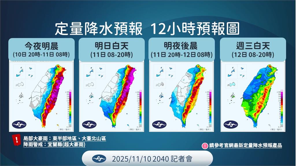 氣象署表示,受颱風外圍環流及東北季風影響,易有短延時強降雨,今晚至明日宜蘭縣山區有局部大豪雨或超大豪雨,台北市山區、新北市山區、宜蘭縣地區、花蓮縣地區、台東縣山區有局部豪雨或大豪雨,新北市地區、台東縣地區、桃園市山區、屏東縣山區及恆春半島有局部大雨或豪雨,基隆、台北地區及新竹至南投、高雄山區有局部大雨發生的機率。