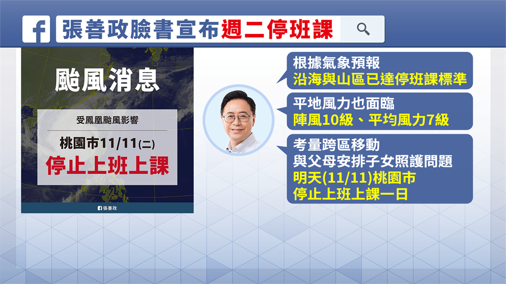 張善政也在臉書上解釋,因為根據氣象預報,沿海和山區已達停班課標準,考量跨區移動和父母照護問題,才決定11日停止上班上課,至於新北宣布沿海、山區停班課;台北市陽明山區同樣比照辦理。