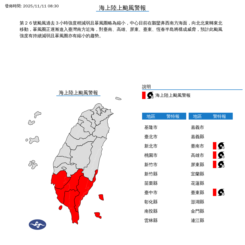 鳳凰颱風持續北上朝台灣本島移動,暴風圈逐漸進入近海海域,中央氣象署除了在清晨發布陸上颱風警報,上午8點半也擴大警戒範圍,新增台南、台東地區,提醒台南、高雄、屏東、台東、恆春半島等5地區都須嚴加戒備;另外,因東北季風共伴效應,宜蘭縣列入降雨警戒區。