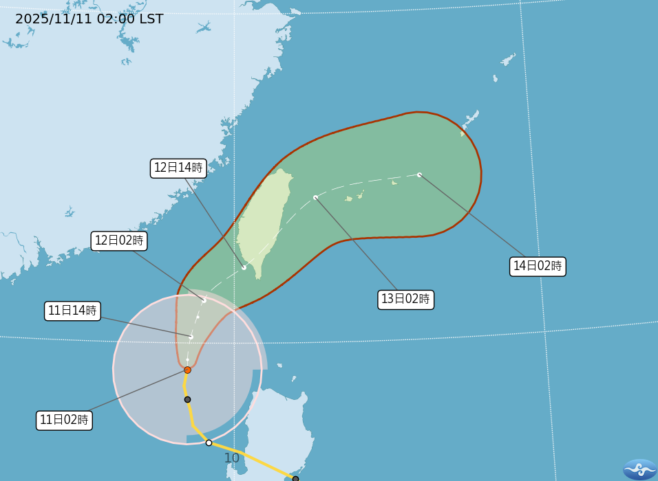 海上陸上颱風警戒區。圖/翻攝自中央氣象署氣象署資深預報員朱美霖說明,鳳凰颱風目前的位置在鵝鑾鼻西南方大約350公里的海面上,未來將持續往偏北到北北東方向移動,預估今天晚間左右來到西南方近海,明(12)天下午到傍晚有機會從南部陸地登陸,屆時受到地形破壞,颱風的強度會快速減弱,影響台灣的期間以輕颱為主,並在朝東北出海的過程中,就會減弱為熱帶性低氣壓,甚至進一步變成為溫帶氣旋,這段期間大約是明天傍晚到週四(13日)清晨。